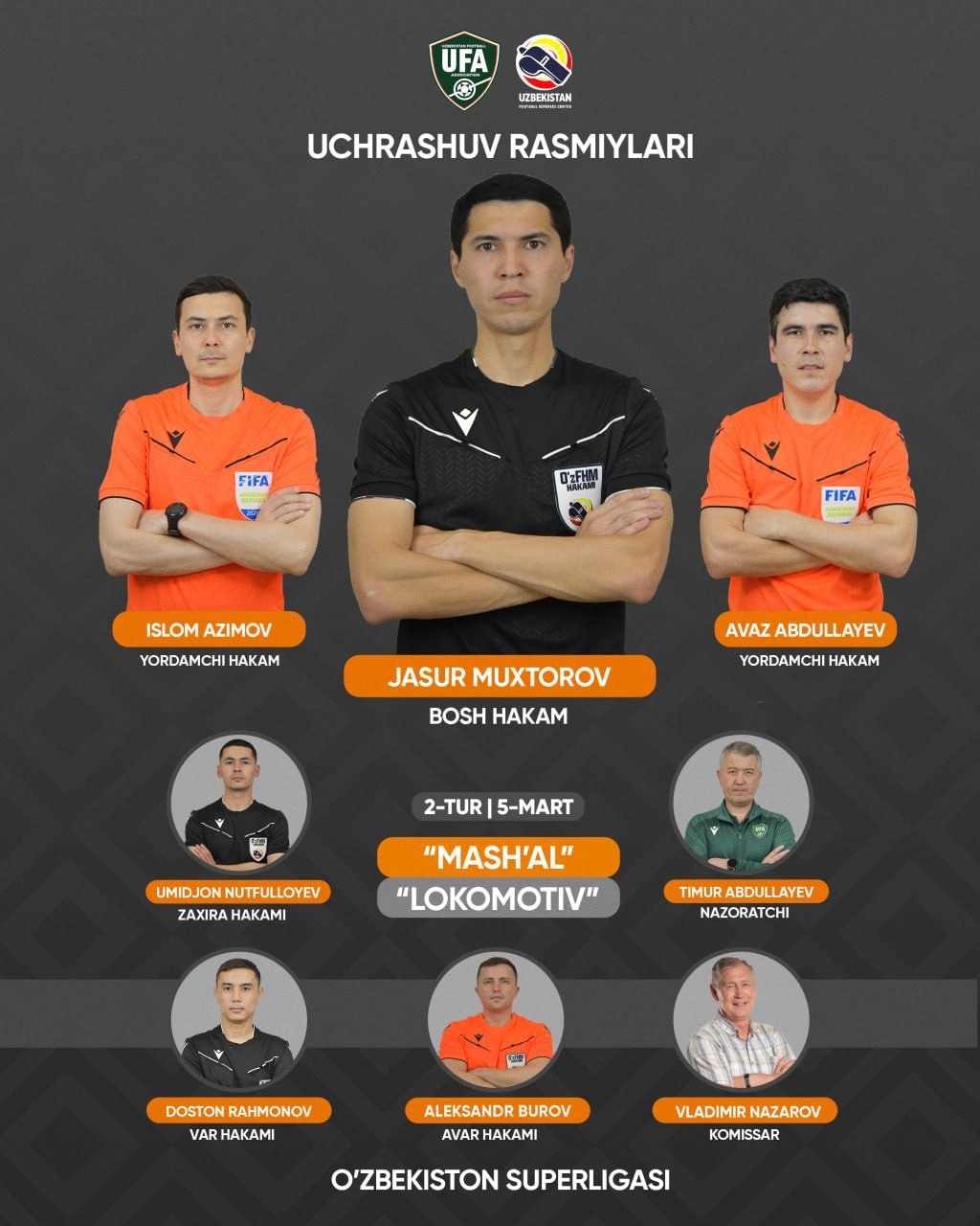 G’uzorda bo‘lib o‘tadigan "Mash’al" - "Lokomotiv" uchrashuvini Jasur Muxtorov boshqarib boradi. Unga qanotlarda Islom Azimov va Avaz Abdullayevlar yordam berishadi. Zahira hakami Umidjon Nutfulloyev. Hakamlarni Timur Abdullayev nazorat qiladi. Uchrashuv komissari. Vladimir Nazarov
